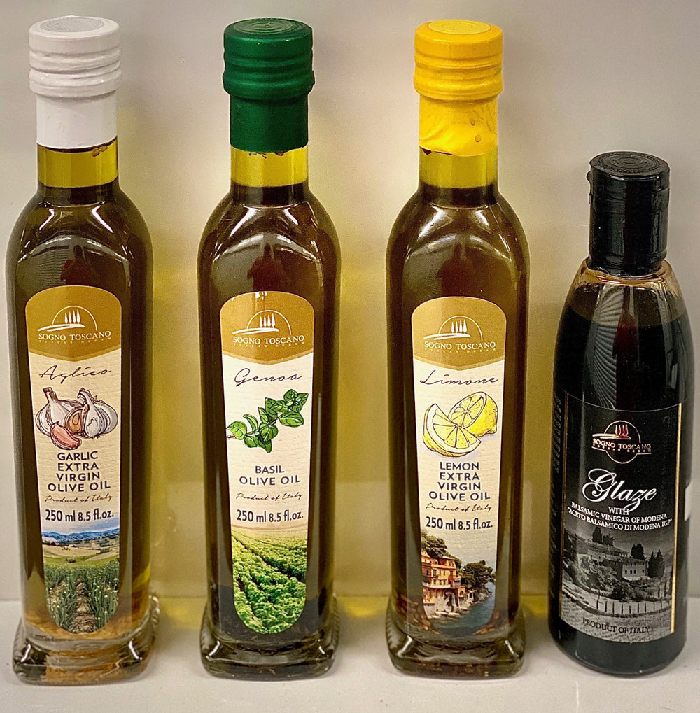 A combination of the most used flavors. Use together or separate. A must in every kitchen. Set consists of Roasted Garlic, Baby Basil, Amalfi Lemon EVOO plus a classic IGP Balsamic Glaze from Modena.
